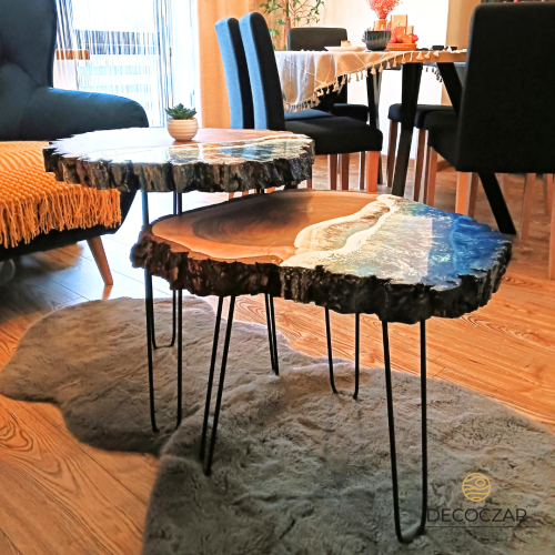 Stolik kawowy z drewna tekowego z żywicą na kółkach