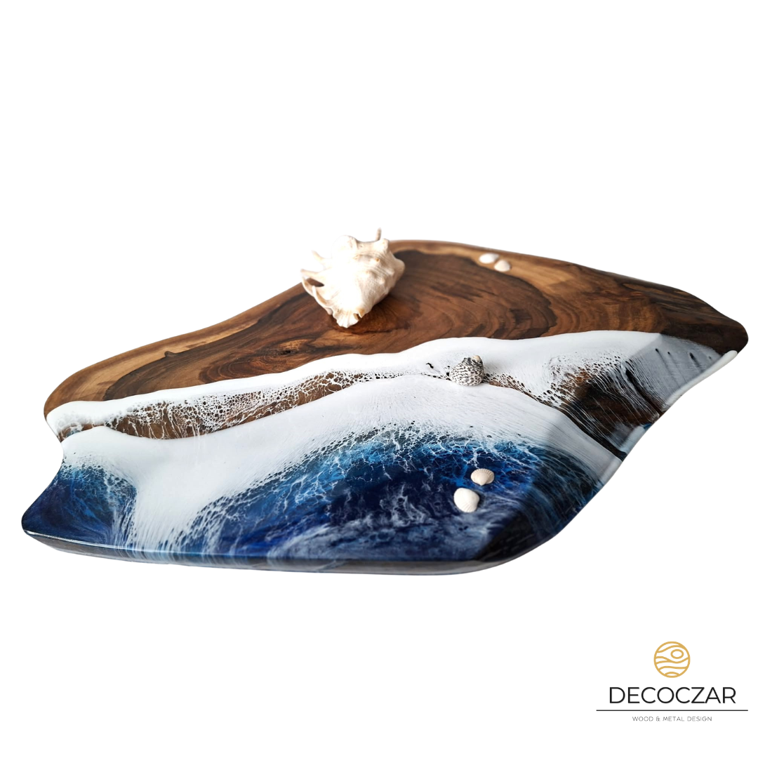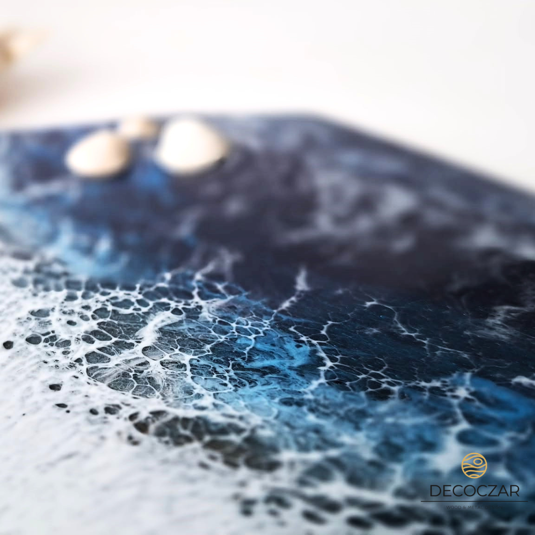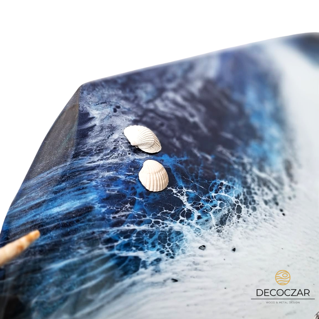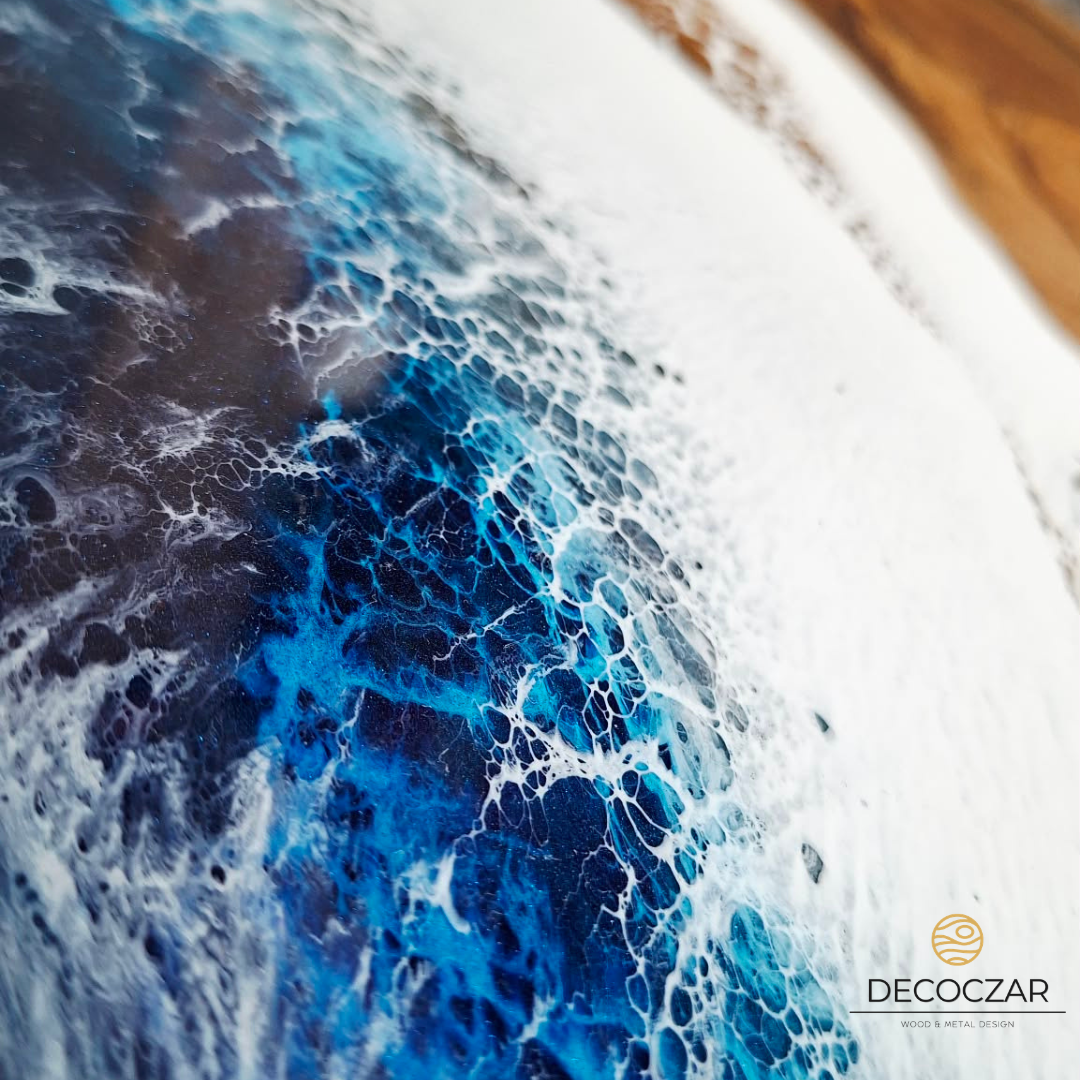 Powierzchnię zdobi efekt spektakularnych, morskich fal wykonanych z żywicy. Ich realistyczna forma przywodzi na myśl linię brzegową i rozbijające się o piasek fale. Subtelny dodatek brokatowego pyłku sprawia, że całość delikatnie mieni się w świetle słonecznym, tworząc efekt iskrzącej się tafli wody.