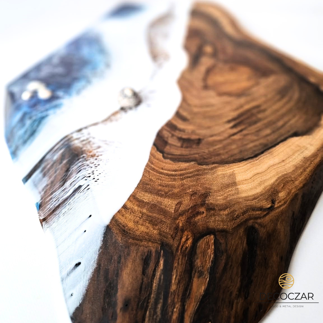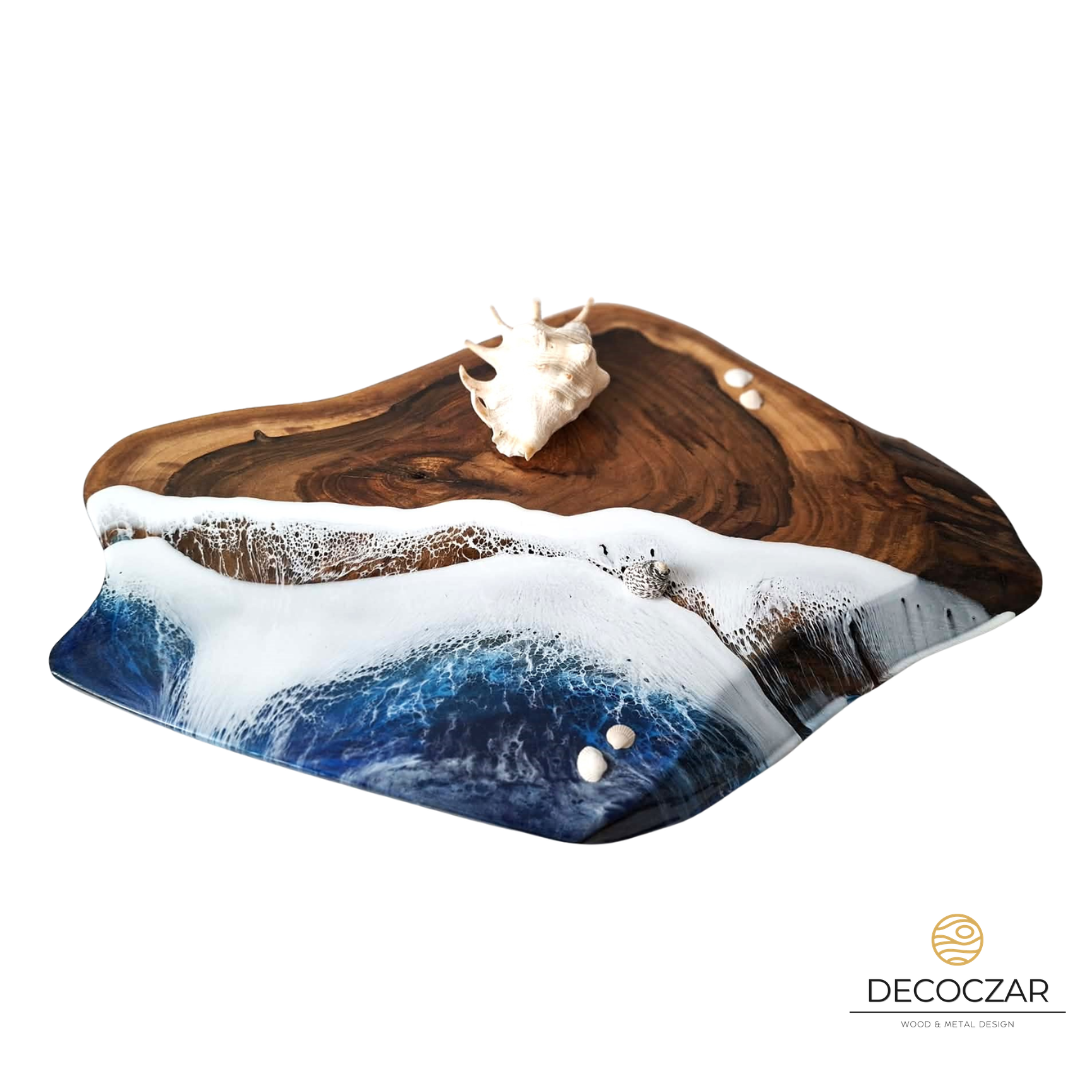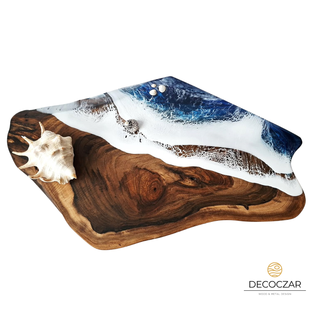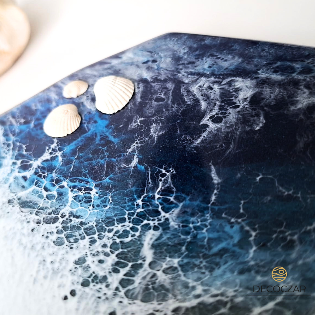 Powierzchnię zdobi efekt spektakularnych, morskich fal wykonanych z żywicy. Ich realistyczna forma przywodzi na myśl linię brzegową i rozbijające się o piasek fale. Subtelny dodatek brokatowego pyłku sprawia, że całość delikatnie mieni się w świetle słonecznym, tworząc efekt iskrzącej się tafli wody.