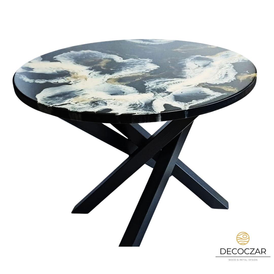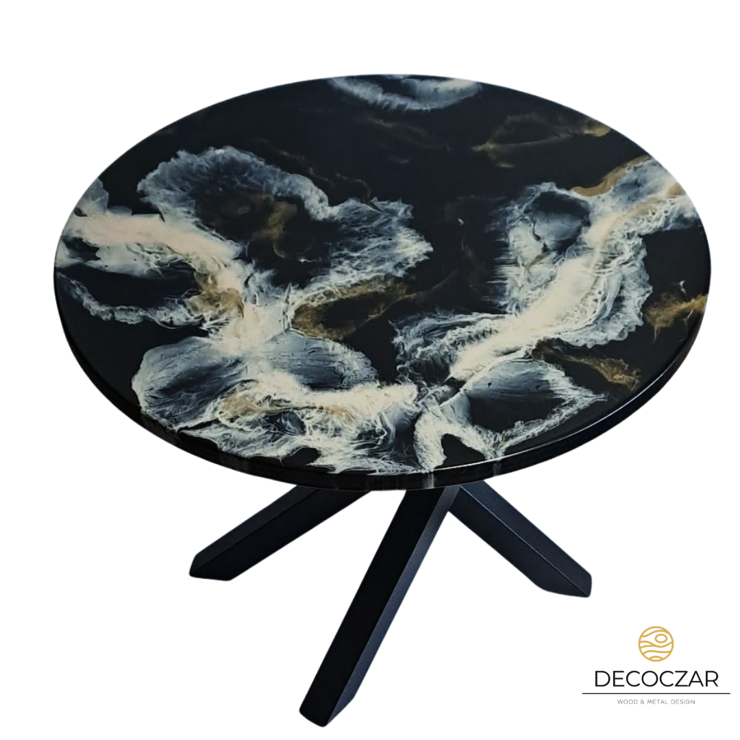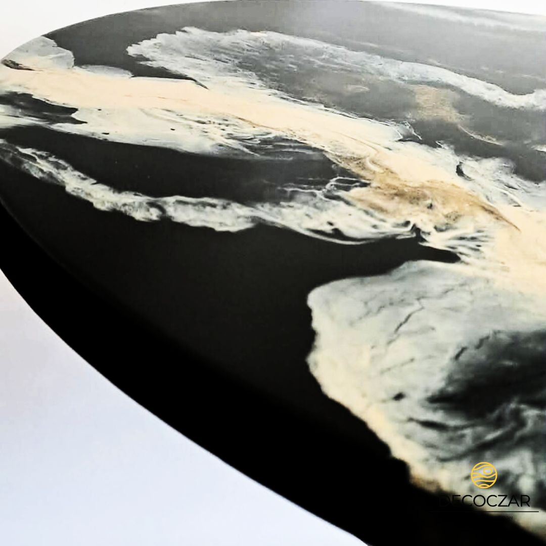 Blat wykonany z żywicy to prawdziwe dzieło sztuki użytkowej – dynamiczne przejścia czerni, beżu i szarości tworzą niepowtarzalną kompozycję, dzięki czemu każdy egzemplarz jest unikatowy. Efekt przypomina naturalne struktury kamienia, dymu i chmur, przyciągając wzrok i nadając wnętrzu ekskluzywnego charakteru.