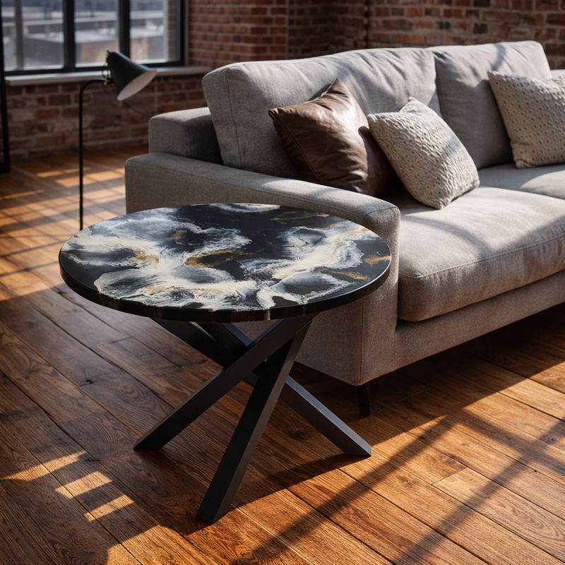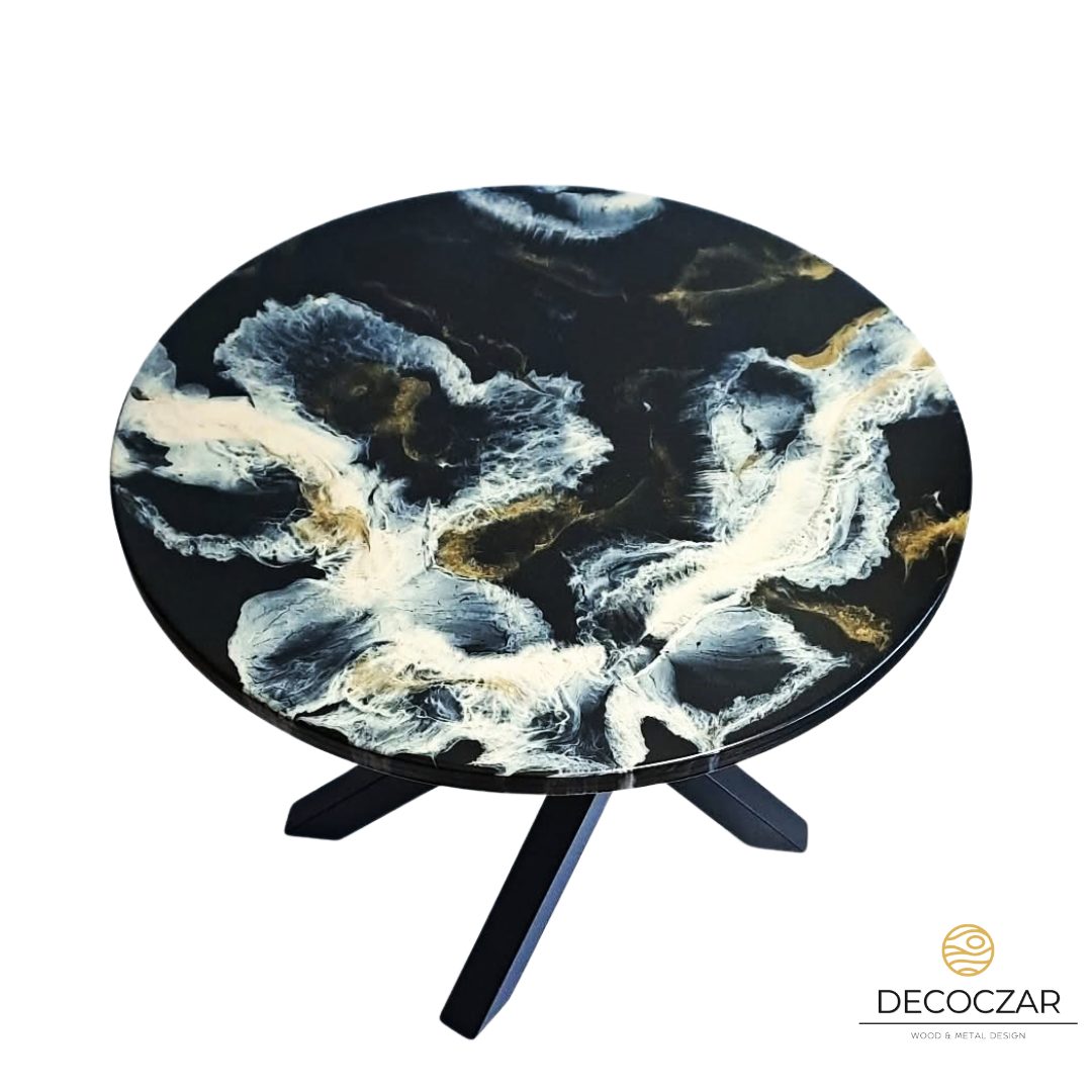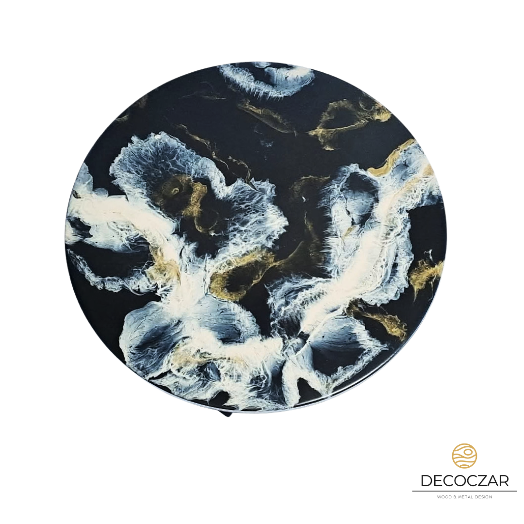 Blat wykonany z żywicy to prawdziwe dzieło sztuki użytkowej – dynamiczne przejścia czerni, beżu i szarości tworzą niepowtarzalną kompozycję, dzięki czemu każdy egzemplarz jest unikatowy. Efekt przypomina naturalne struktury kamienia, dymu i chmur, przyciągając wzrok i nadając wnętrzu ekskluzywnego charakteru.
