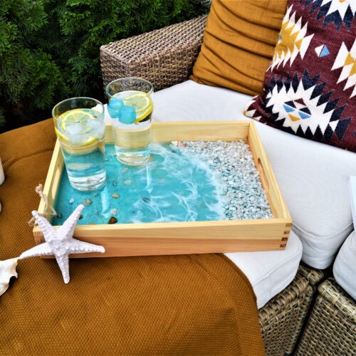 Jej głównym elementem jest żywica epoksydowa, która wraz z autorskim sposobem barwienia, stanowi przedmiot codziennego użytku w formie małego dzieła sztuki. Każda taca jest inna i niepowtarzalna. Główne motywy kolorystyczne to czerń i złote dodatki które odbijają pięknie światło a połączenie ze złotymi uchwytami nadaje oryginalnego design – aby taca utrzymała się jak najdłużej w swojej najlepszej formie należy unikać kontaktu z gorącymi i ostrymi przedmiotami.