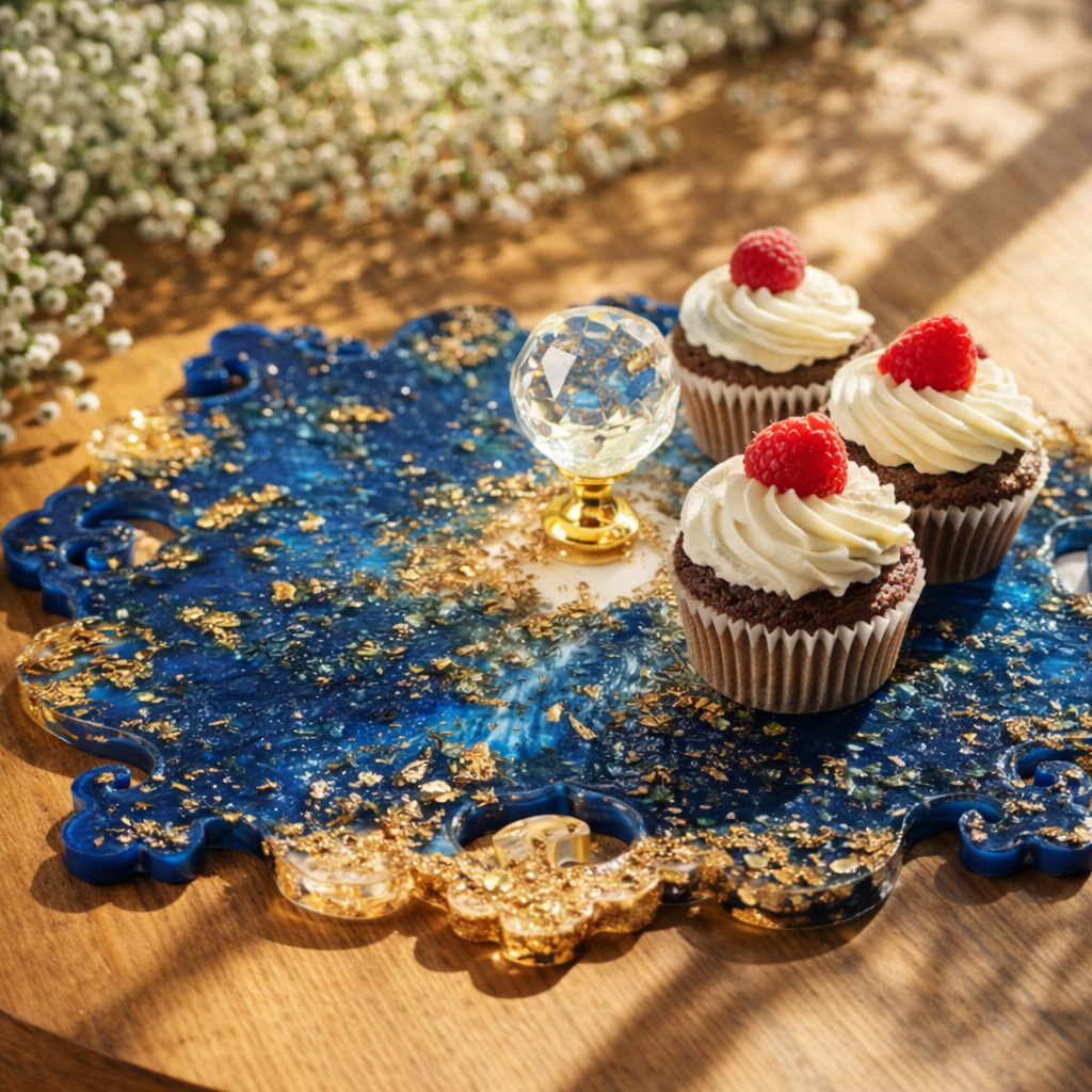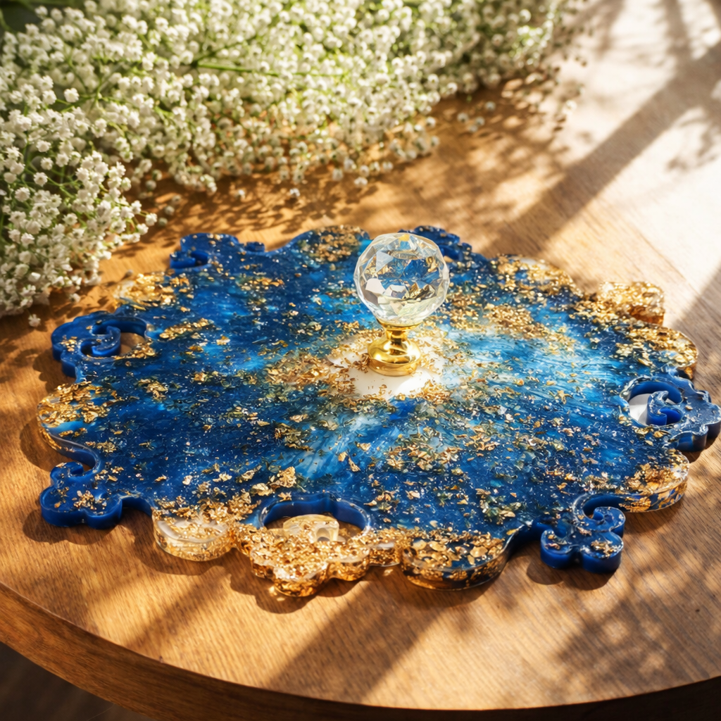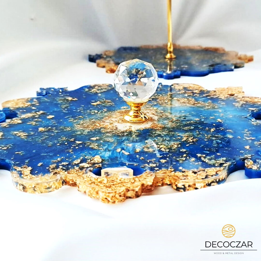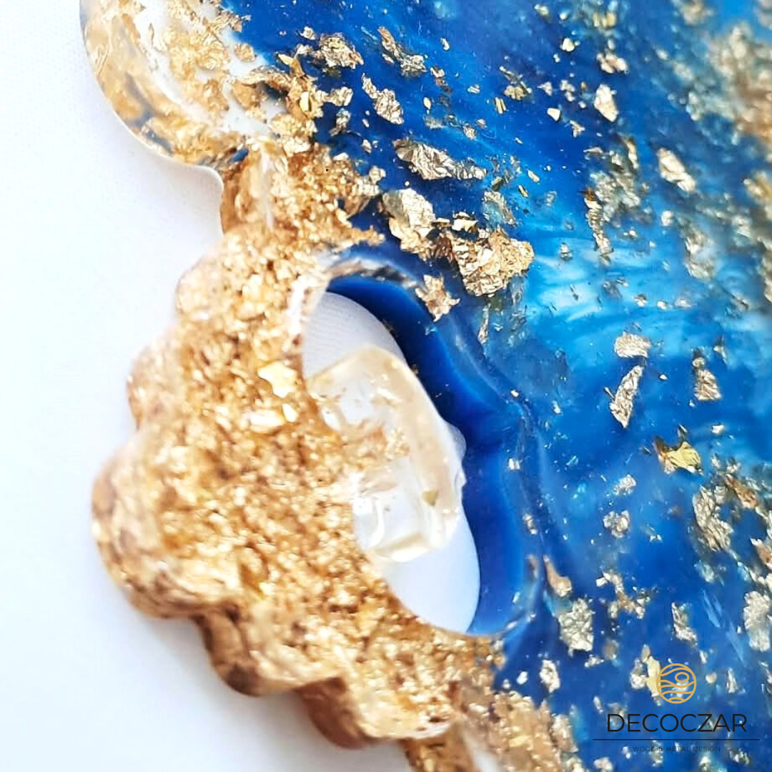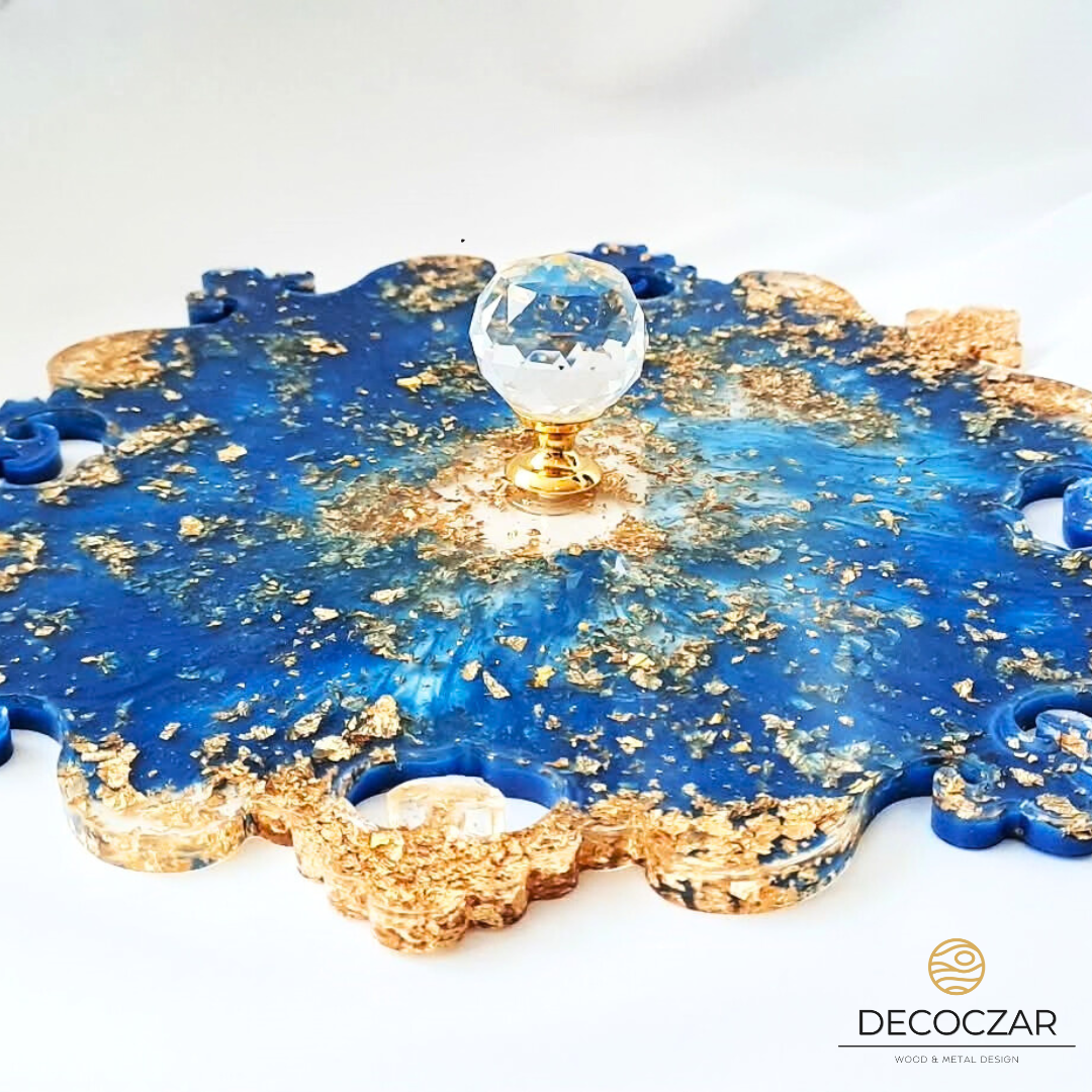 Głębokie, królewskie odcienie niebieskiego w połączeniu ze złotą, zatopioną w żywicy folią tworzą spektakularny efekt, który przyciąga wzrok i podkreśla ekskluzywny styl produktu. Centralny, kryształowy uchwyt dodaje całości elegancji i sprawia, że patera prezentuje się niczym biżuteria dla wnętrza.
