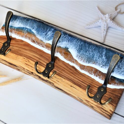 Dębowy wieszak z dodatkiem żywicy wykonany w morskim stylu to niepowtarzalny dodatek do wnętrz. Starannie wyselekcjonowane drewno o drobnych słojach i różnorodnych sękach obrabiane jest tradycyjnymi metodami.