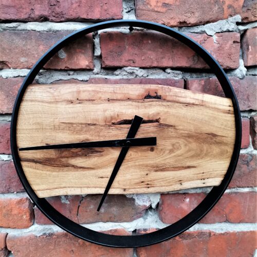 Obręcz poniższego zegara wykonana została ze stali malowanej na czarny mat, a wypełnienie z dębowej deski wykończonej wysokiej jakości olejowoskiem. Drewno wykorzystane w tym zegarze charakteryzuje się nietuzinkowym usłojeniem co sprawia, że będzie się on wyróżniał na każdej ścianie.